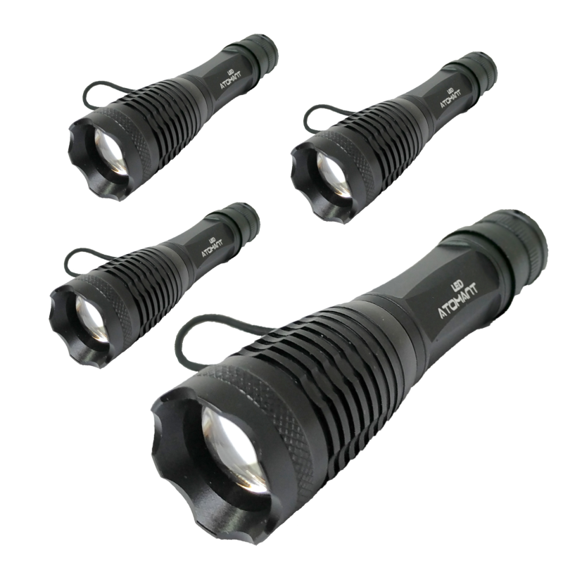 Spezifikationen: 1. Material: Aluminiumlegierung 2. Lichtquelle: T6 LED 3. 5 Schaltmodi: Hoch / Mittel / Niedrig / Blitz / SOS 4. Leuchtweite: 300 - 500 m 5. Stromversorgung: Eine 18650 Batterie (im Lieferumfang enthalten) oder drei AAA-Batterien (nicht im Lieferumfang enthalten) Paket 1x Taschenlampe 1x 18650 Batterie 1x Transparente Abdeckung für 18650 Batterie 1x Batteriehalter für AAA-Batterien 1x Netzladegerät 1x Handschlaufe 1x Schutzhülle.