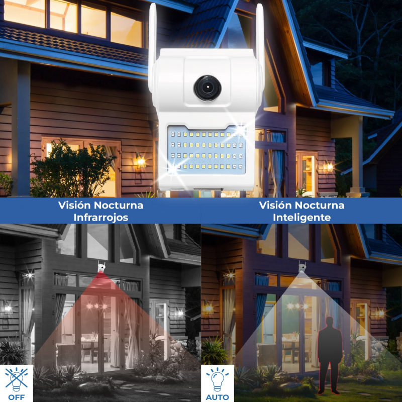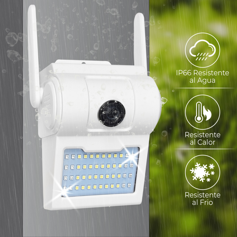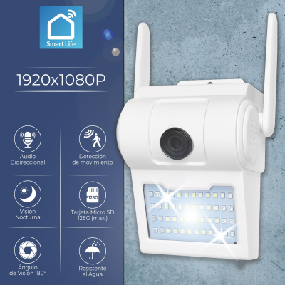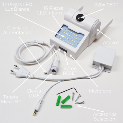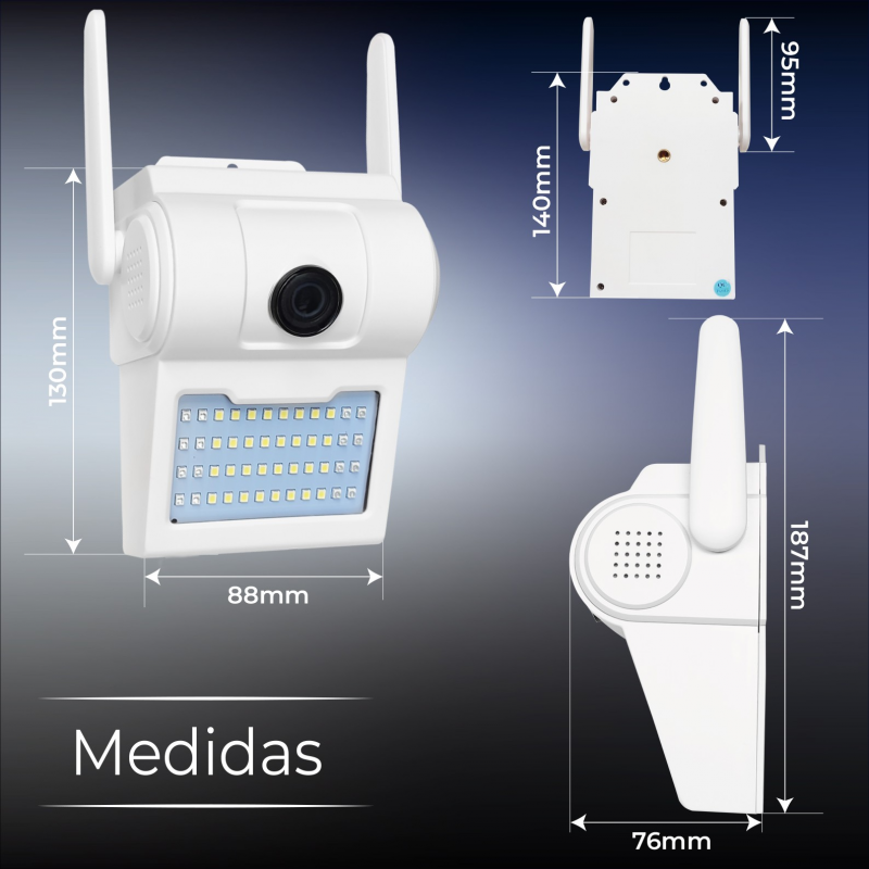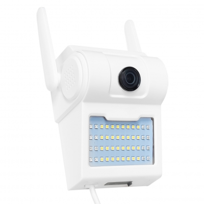 Die Kamera ist für die Montage auf einer ebenen Fläche vorgesehen, und im Lieferumfang sind die Befestigungsschrauben enthalten. Dank der ABS-Konstruktion und der Wasserdichtigkeitsklasse IP66 kann sie sowohl im Innen- als auch im Außenbereich montiert werden. Die Kamera verfügt über einen leistungsstarken Scheinwerfer mit 2000 Lumen, der so programmiert werden kann, dass er sich zu bestimmten Zeiten einschaltet. Darüber hinaus verfügt das Objektiv über einen Infrarot-Nachtsichtmodus mit einer Reichweite von bis zu 30 Metern.
