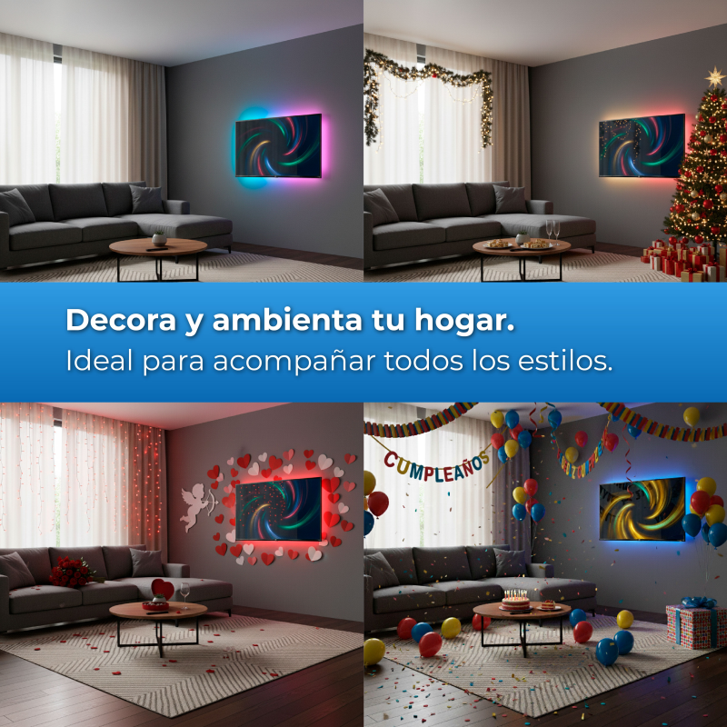 Give your home a new style with this 2-meter RGB LED light strip, a modern, versatile and easy-to-install decorative lighting solution. Its 5V USB power supply, without the need for traditional plugs, makes it ideal for use with TVs, computers, consoles or power banks, offering greater safety and convenience in indoor spaces such as bedrooms, living rooms, desks or gaming areas.