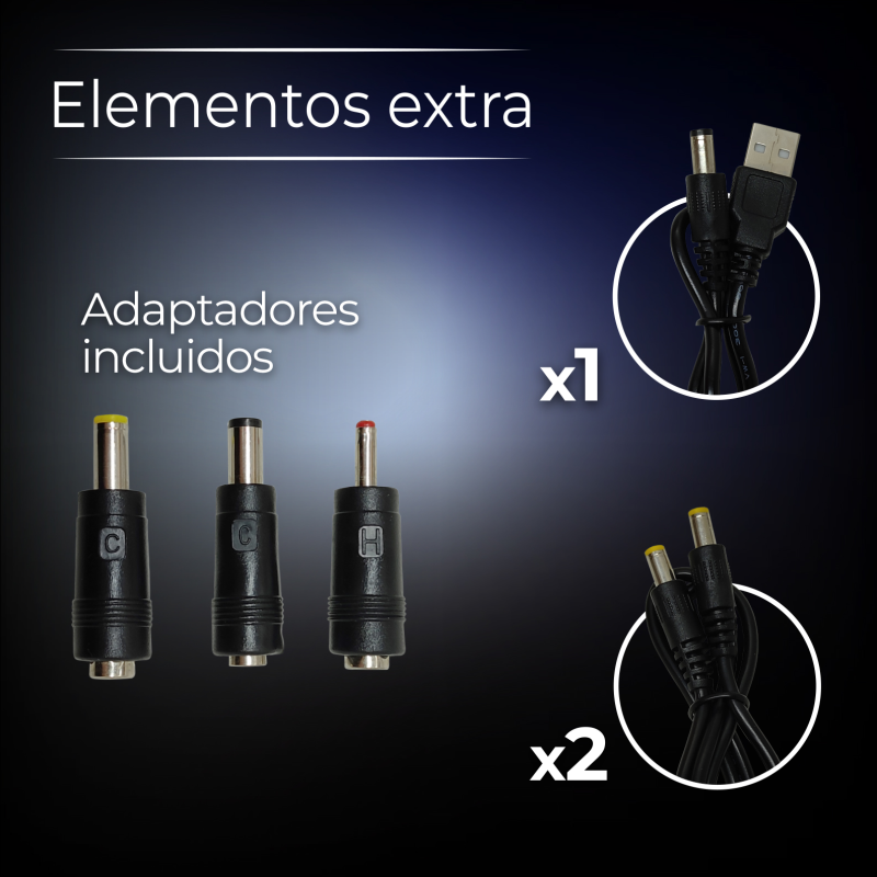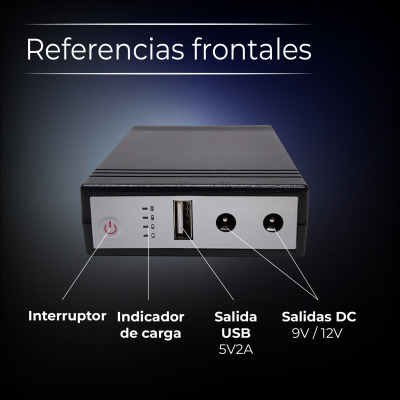 El dispositivo cuenta con una entrada de corriente directa (DC) de 12V 2A, una salida USB de 5V, y dos salidas DC de 9V/12V, ofreciendo múltiples opciones para conectar y mantener operativos diversos equipos electrónicos. La batería de litio integrada, con una capacidad de 10400mAh, no solo permite el funcionamiento continuo durante una falla de energía, sino que también puede utilizarse como un práctico power bank para cargar otros dispositivos a través del puerto USB.