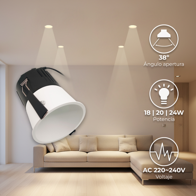 Este downlight funciona directamente a 220V, eliminando la necesidad de transformadores adicionales y simplificando su instalación.