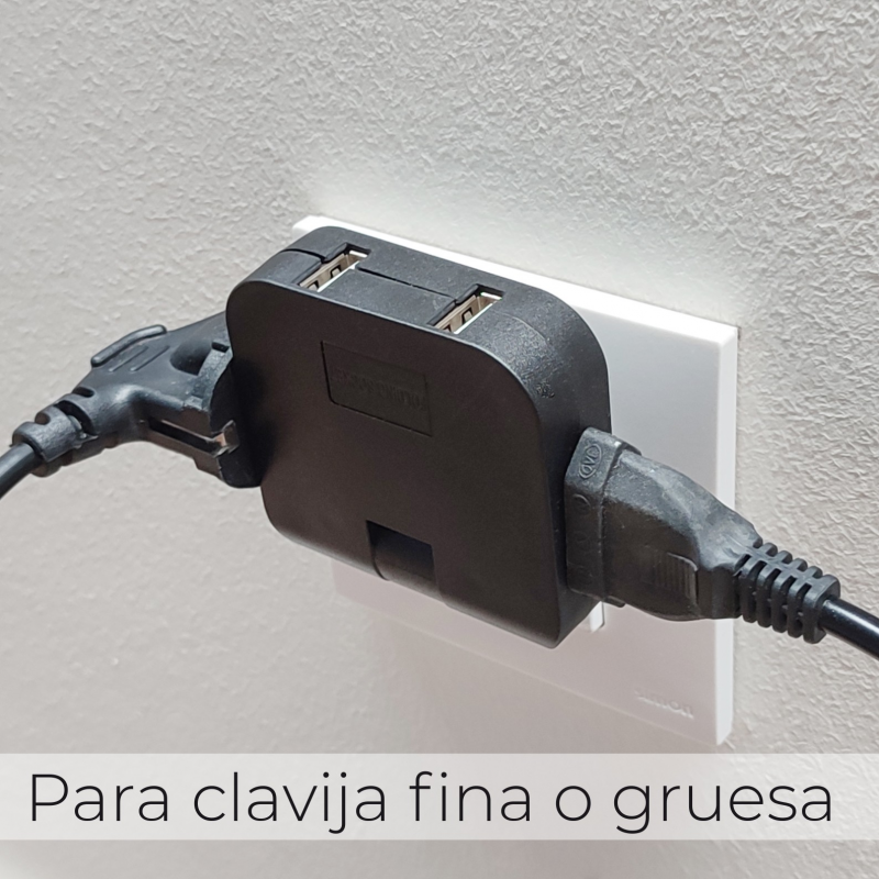 Enchufe ultra plano con 2 Adaptadores (Europeo y Americano) y 2 Puertos USB. Cabezal Giratorio 180º
