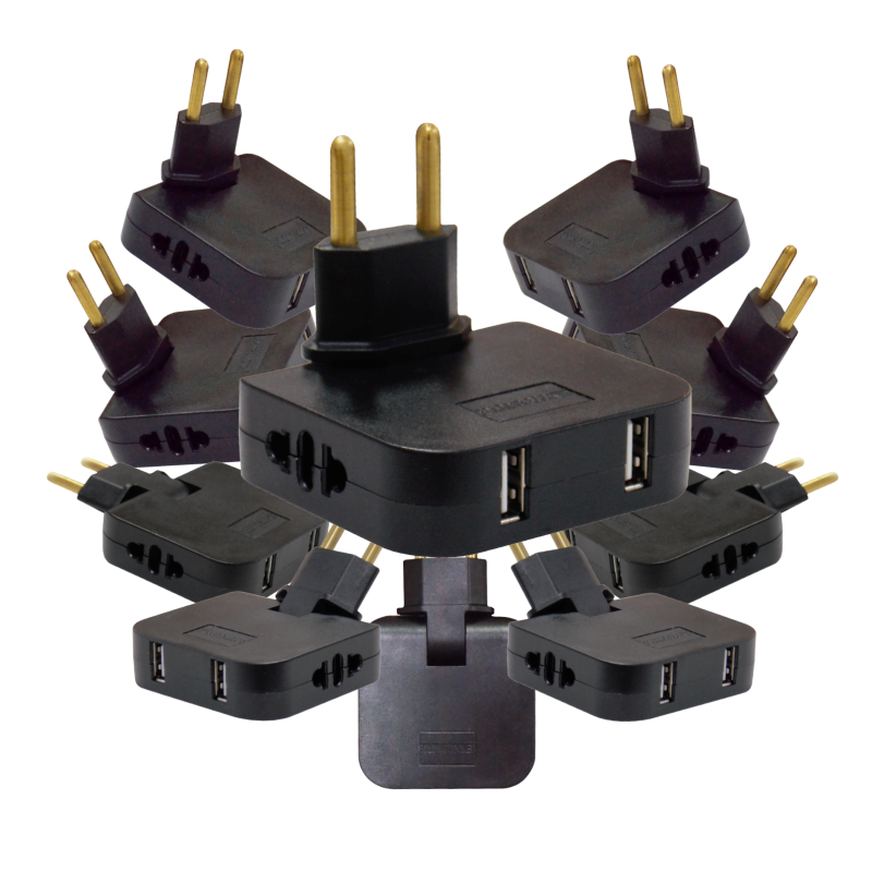 Enchufe ultra plano con 2 Adaptadores (Europeo y Americano) y 2 Puertos USB. Cabezal Giratorio 180º