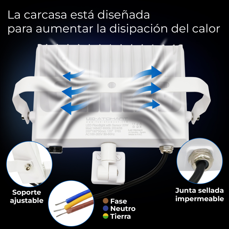 El Foco Proyector de 20W con detector de presencia destaca por su diseño compacto y acabado minimalista pensado para substituir una luminaria halógena de hasta 105W, consiguiendo un ahorro energético de más del 90%.