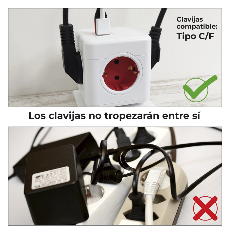 El diseño compacto del Enchufe Cubo maximiza el uso del espacio, siendo ideal para escritorios, mesitas de noche y áreas de trabajo. Fabricado con materiales de alta calidad, está equipado con protección contra sobrecargas, sobrecorrientes y cortocircuitos, garantizando la seguridad de tus dispositivos y del entorno.