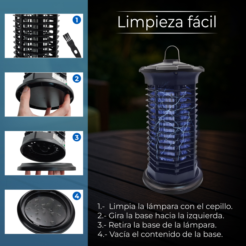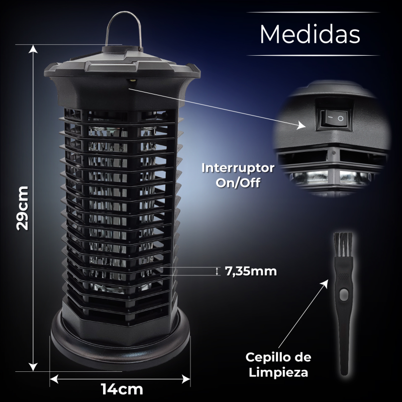 ¿Cómo se usa? Muy fácil: puedes colocarla sobre una superficie o colgarla gracias a su anilla superior integrada. El interruptor físico permite encenderla o apagarla cómodamente, sin necesidad de desconectarla. Además, cuenta con una bandeja extraíble donde caen los insectos eliminados y un pincel incluido que facilita la limpieza, garantizando un mantenimiento rápido y sencillo. La bandeja se encuentra en la base y se puede retirar girándola para limpiar facilmente los mosquitos.