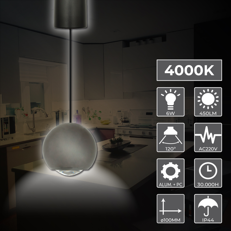 La Lámpara de Techo Moderna Esfera de 6W combina diseño contemporáneo y eficiencia. Destaca su luminosidad de 450 lúmenes, un ángulo de apertura de 120º proporcionando una luz atractiva y de alta calidad con un índice de reproducción cromática de +90 CRI, indicativo de la calidad de luz que entrega.