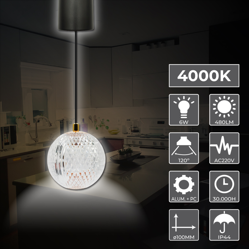 La Lámpara de Techo Moderna Transparente de 6W combina diseño contemporáneo y eficiencia. Destaca su luminosidad de 480 lúmenes, un ángulo de apertura de 120º proporcionando una luz atractiva y de alta calidad con un índice de reproducción cromática de +90 CRI, indicativo de la calidad de luz que entrega.