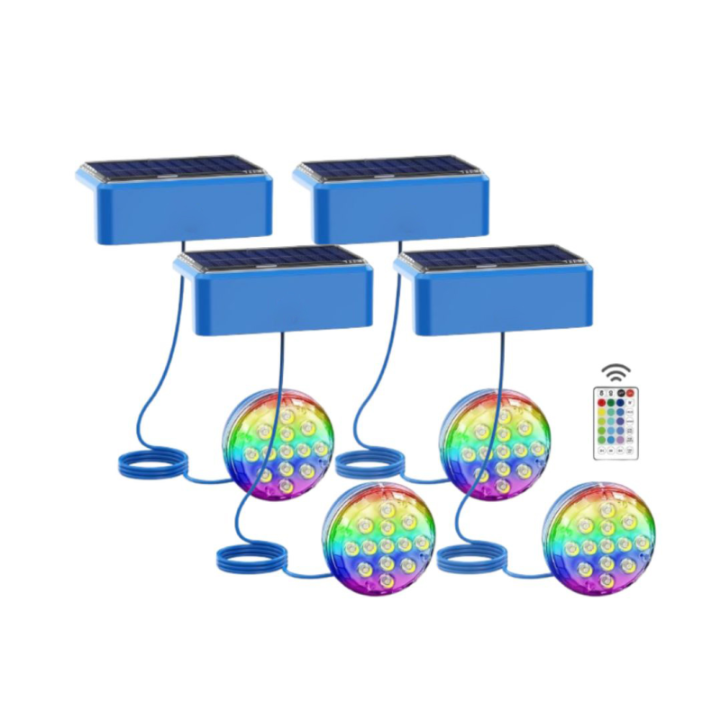 • Luces LED sumergibles solares RGB de 2,6W con 1 metro de cable y batería de alta capacidad con 1500mAh, ideales para piscinas, fuentes y estanques.