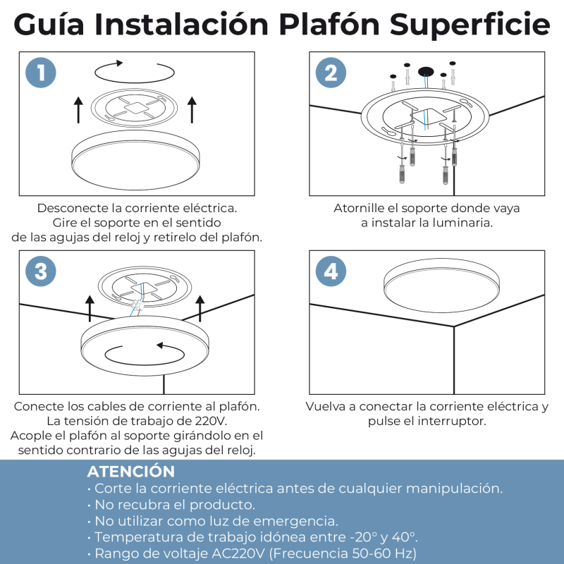 • Plafón de superficie listo para instalar en cualquier superficie.