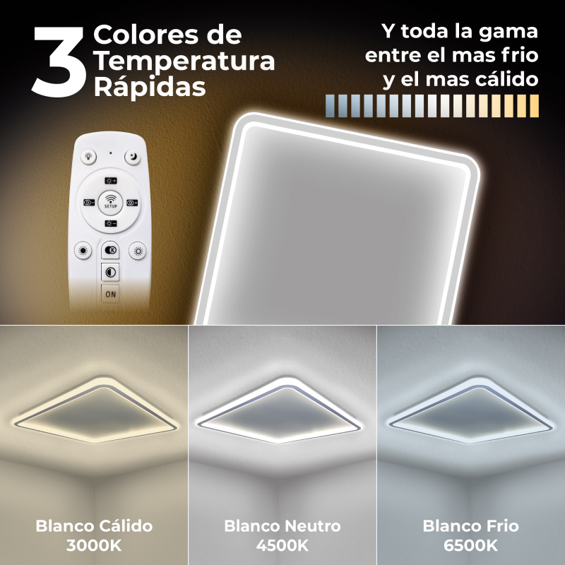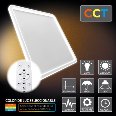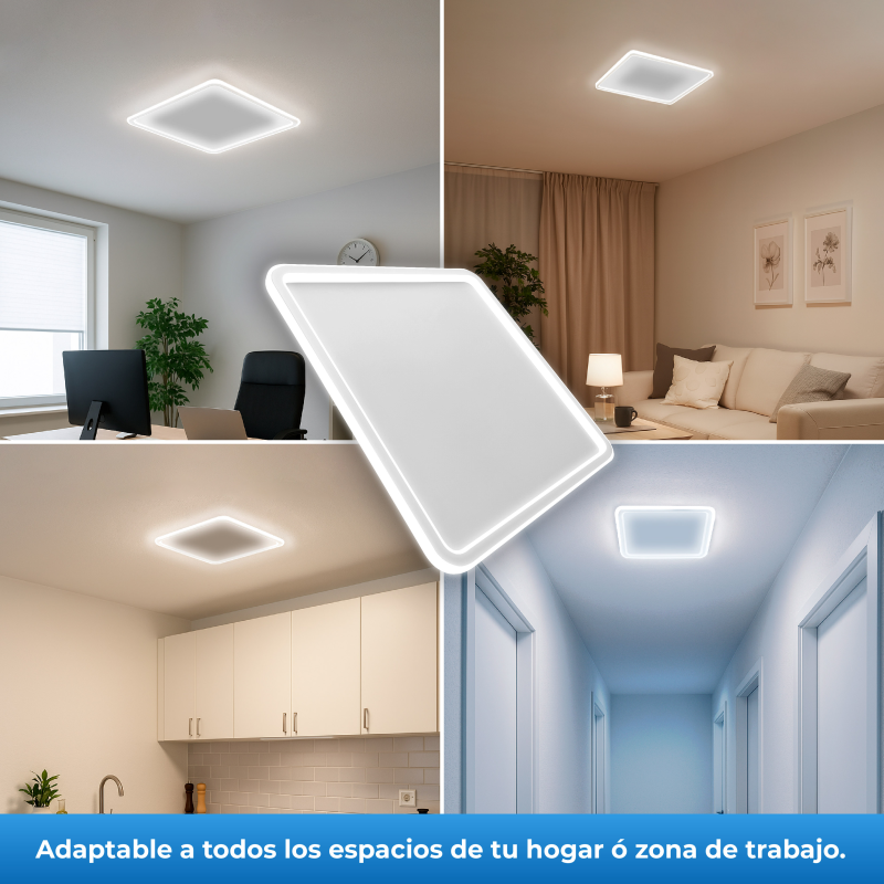 El Plafón LED Cuadrado 36W 50x50 CCT Marco Luz Indirecta con Mando a Distancia es una solución de iluminación moderna y versátil, ideal para cualquier espacio de tu hogar u oficina. Su diseño minimalista y elegante, con un marco brillante, aporta un toque de sofisticación. Este plafón ofrece tecnología CCT (Temperatura de Color Ajustable), permitiéndote elegir entre diferentes tonos de luz (cálido, neutro o frío) según tus necesidades y preferencias. Además, incluye un mando a distancia para un control total de la intensidad y color de la luz, brindando comodidad y personalización a tu ambiente. Fácil de instalar y con bajo consumo energético, es la opción perfecta para quienes buscan eficiencia y estilo en un solo producto.