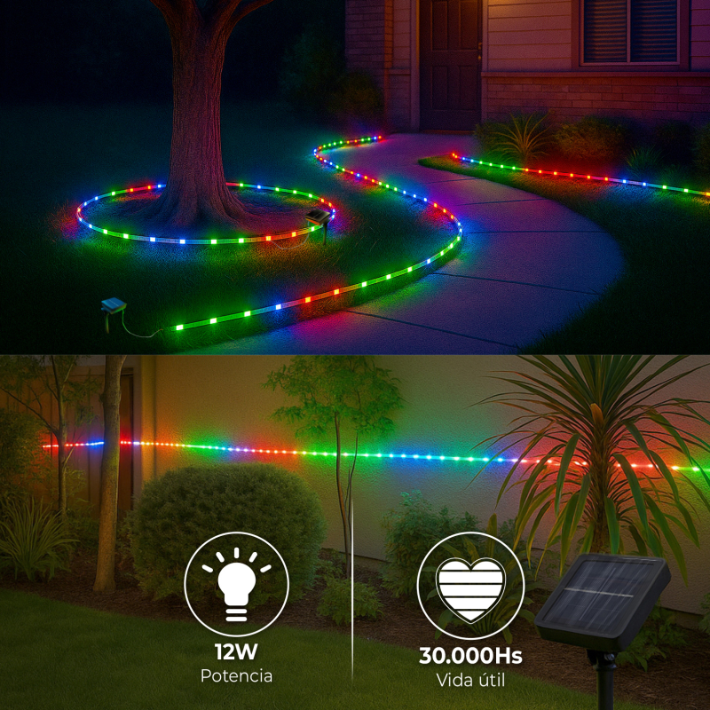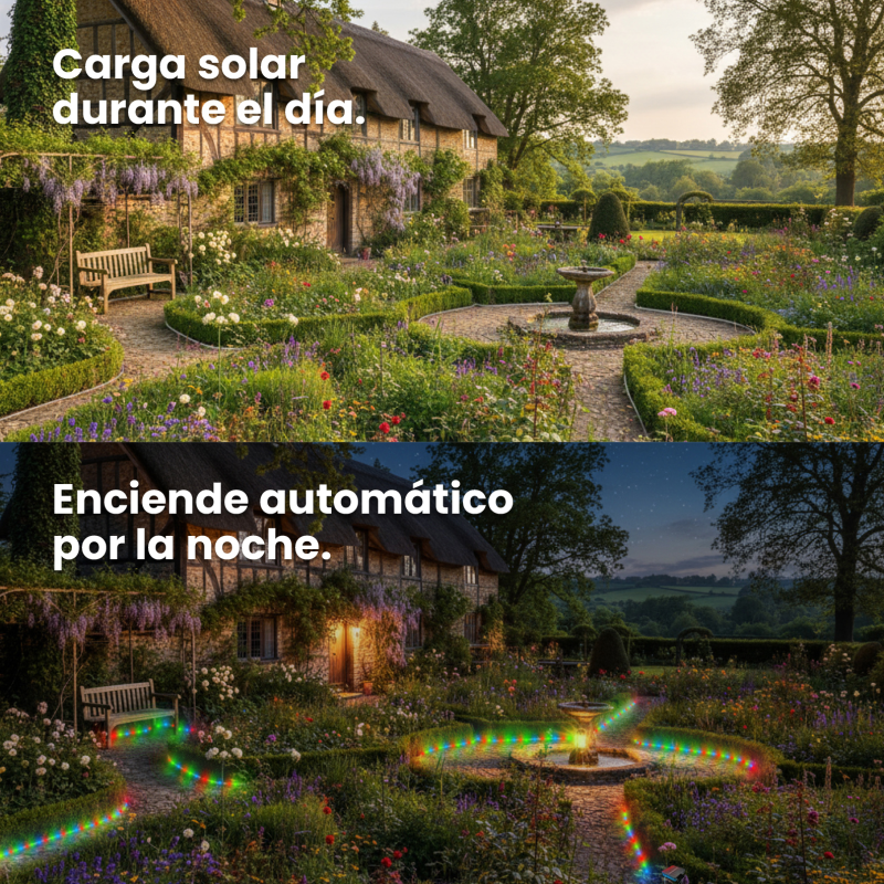 Ideal para quienes buscan una tira LED solar impermeable con luz blanco cálido y sensor crepuscular, capaz de iluminar exteriores de forma autónoma, segura y elegante durante toda la noche.