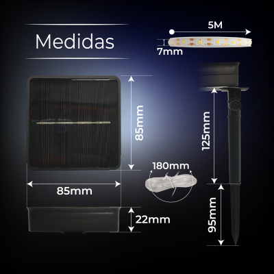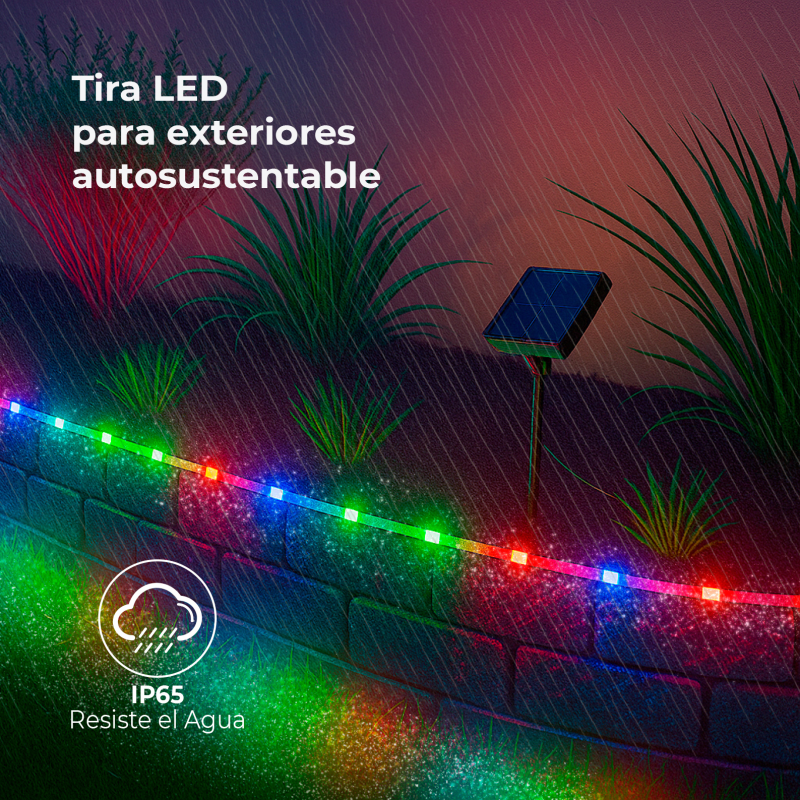 Fabricada con materiales resistentes y grado de protección IP65, esta tira LED exterior solar soporta lluvia, polvo y humedad, manteniendo un rendimiento estable en todo tipo de condiciones. Su diseño flexible de 5 metros de longitud permite recortarla en los puntos indicados y adaptarla fácilmente a cualquier forma o superficie.