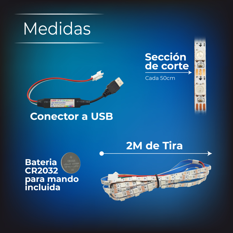 Dale un nuevo estilo a tu hogar con esta tira de luces LED RGB de 2 metros, una solución de iluminación decorativa moderna, versátil y fácil de instalar.