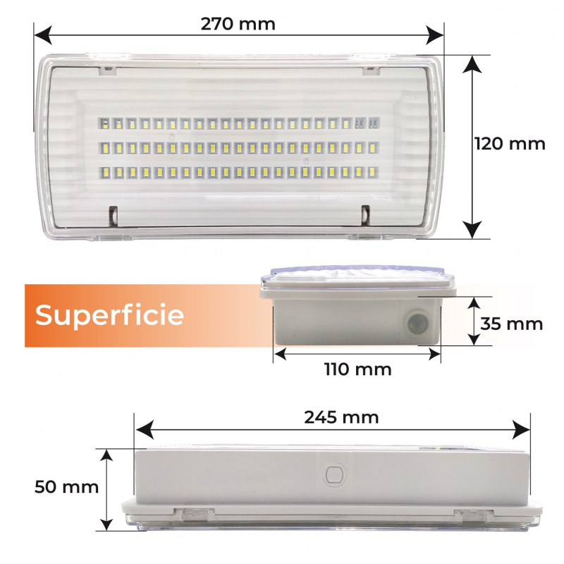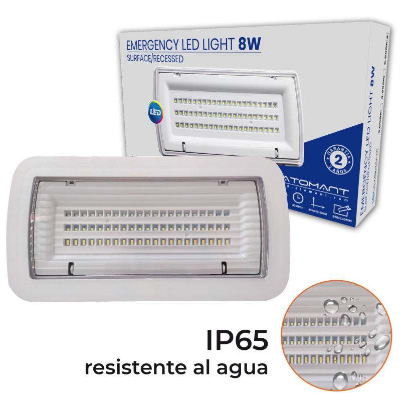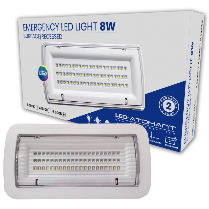 Lumière d’urgence led atomant de 8W avec 450 lumens,un angle de faisceau lumineux de 180º offrant un éclairage large et clair de la zone. Température de couleur 6500K.
