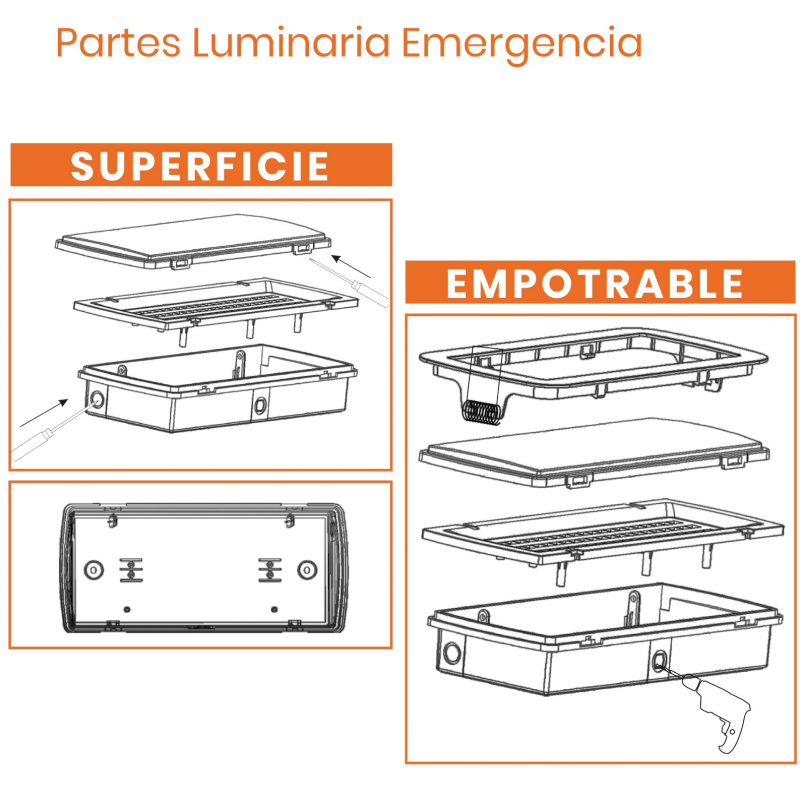 Encastré: En remplaçant l’ancien luminaire par celui-ci, en le plaçant à l’intérieur de l’espace ou en effectuant le trou à un nouvel emplacement. Une fois cette étape effectuée et le câblage raccordé, il est aussi simple que de l’introduire dans l’espace en jetant en arrière les broches de ressorts qui fixent le feu d’urgence.