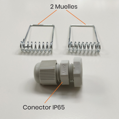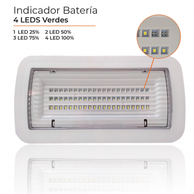 Muy potente, tiene un orificio para pasar los cables de corriente y dos agujeros en la base para atornillar a pared o techo. Ha de llegarle corriente constantemente y se enciende en caso de corte de corriente. No tiene consumo tras dos horas para cargar su bateria y un consumo muy bajo en caso de corte de corriente.