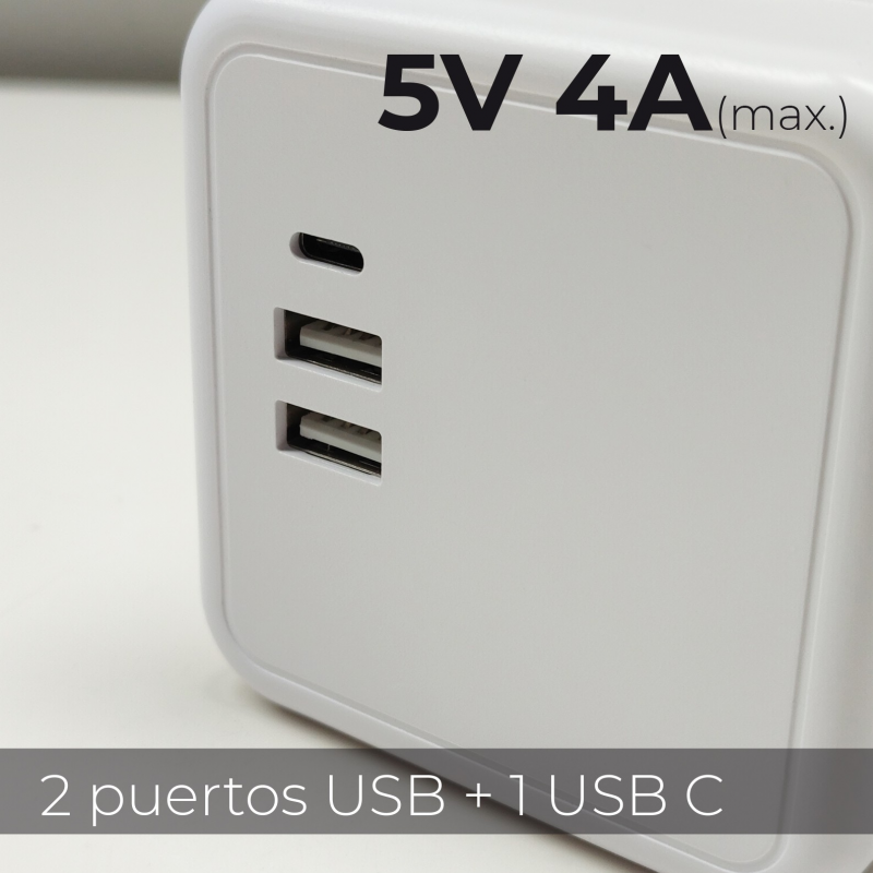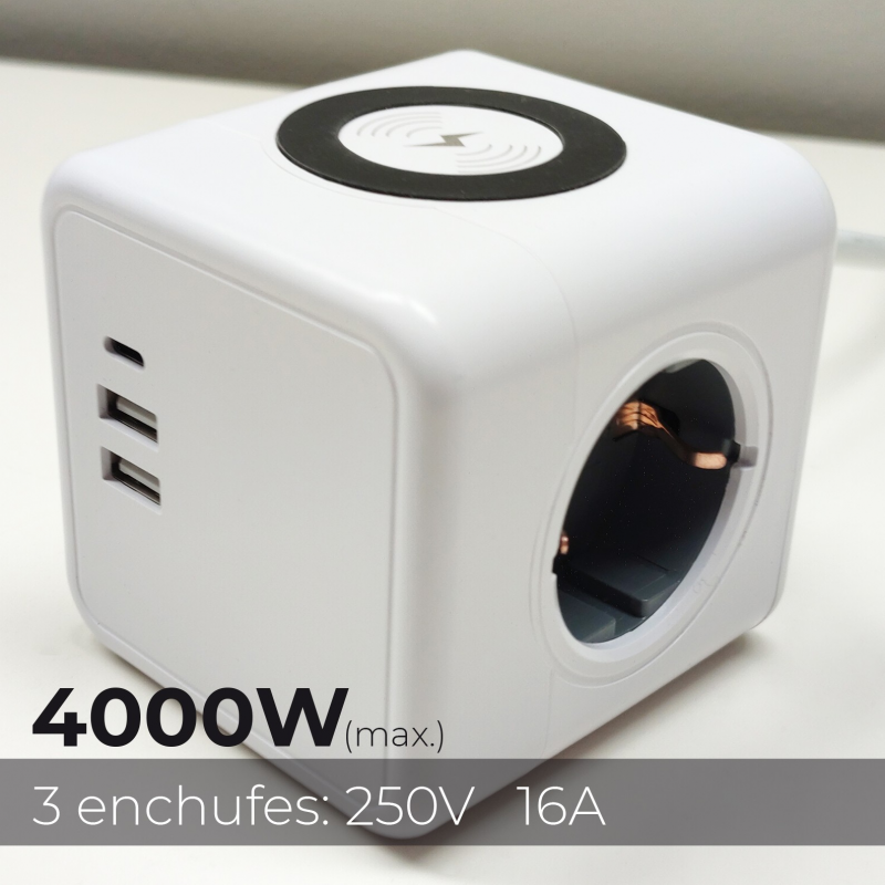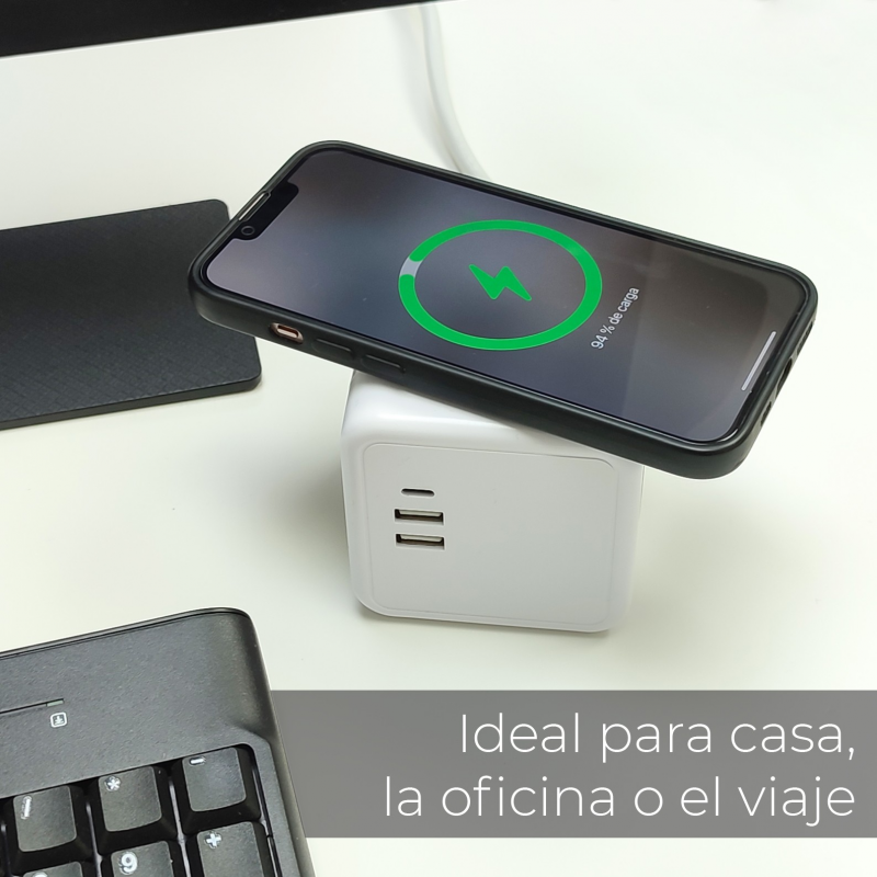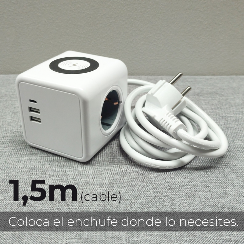Notre Power Magic Cube avec chargeur sans fil 15W offre un design moderne et compact avec un câble de 1,50 mètre de long. Il se distingue par sa petite taille et la disposition de son chargeur sans fil, de ses 3 prises CA et de ses 2 ports USB et 1 port de type C. Il offre la possibilité d'être ancré sur une surface à l'aide d'un support et de ses deux autocollants inclus. Il offre la possibilité d'être ancré sur une surface à l'aide du support et de ses deux autocollants inclus.