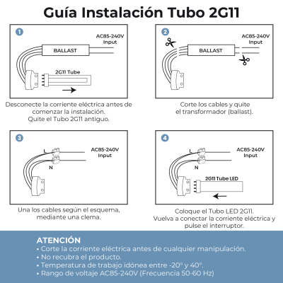 Le raccordement du tube 2G11 doit se faire par un seul côté. Comme il fonctionne à AC85-240V, nous pouvons éliminer la réaction et l’amorçage en optimisant la consommation jusqu’à une durée de vie optimale de 30000 heures. L’allumage du tube est instantané et sans clignotement.