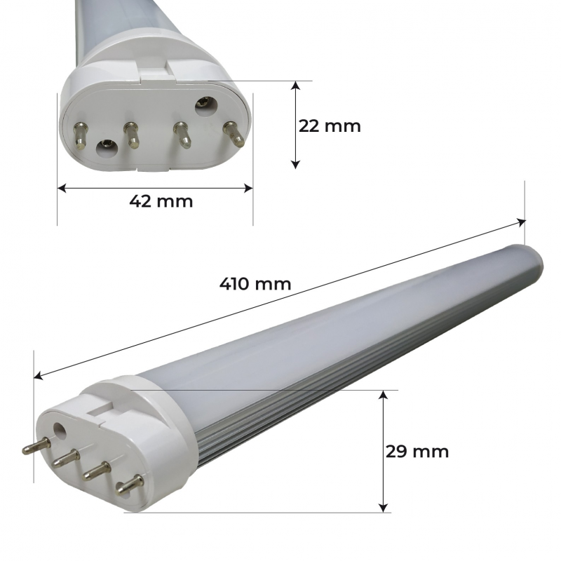 Les dimensions du tube 2G11 sont de 410x42x29 millimètres et sont les plus standardisées pour le remplacement de l’halogène ou à faible consommation.