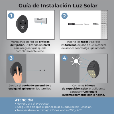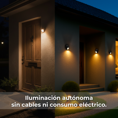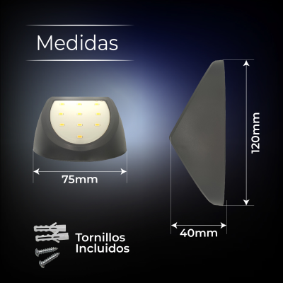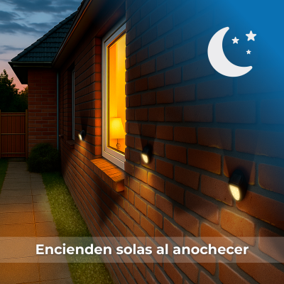 [Installazione senza cavi] Non richiede alcun collegamento elettrico. Il suo funzionamento è completamente autonomo e automatico: si accende al tramonto e si spegne all’alba grazie al sensore crepuscolare integrato. Il design compatto (120 × 75 mm) e la finitura nera consentono un’installazione semplice e discreta su qualsiasi superficie murale.