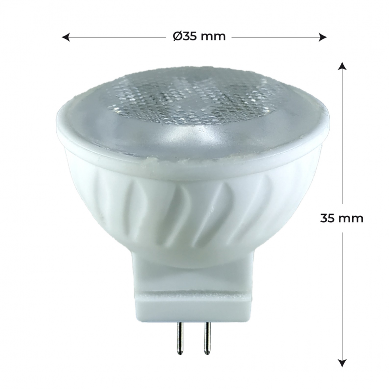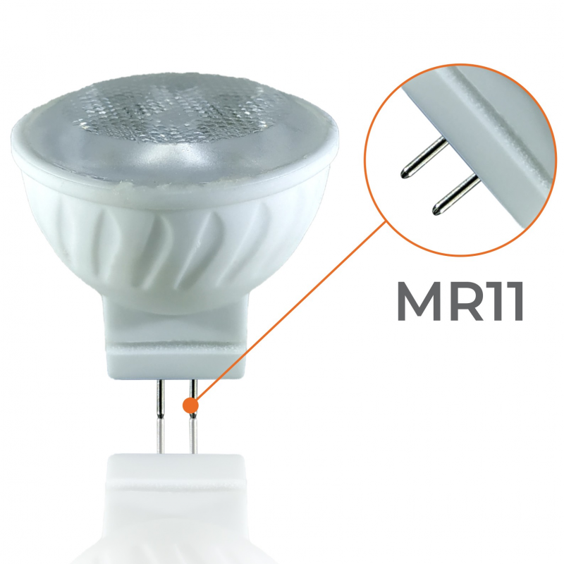 Le lampadine LED MR11 sono più piccole delle loro controparti MR16, con la stessa distanza tra i pin bi-pin. Funzionano a 12 V e richiedono un trasformatore.