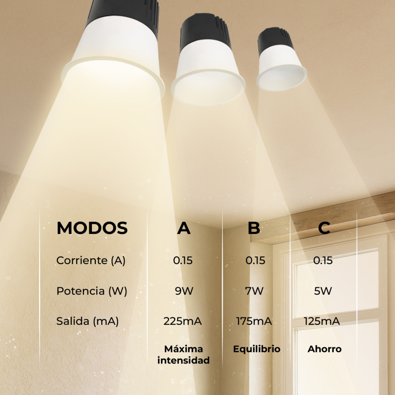 Tra le sue principali caratteristiche ci sono i suoi 3 livelli di potenza (5W, 7W e 9W), che permettono di regolare il livello di illuminazione secondo le necessità, offrendo diversi livelli di lumen per ogni ambiente.