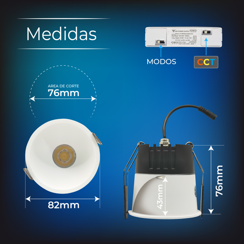 Integra un sistema CCT selezionabile (3000K, 4000K e 6500K), permettendo di scegliere tra luce calda, neutra o fredda in un unico prodotto.
