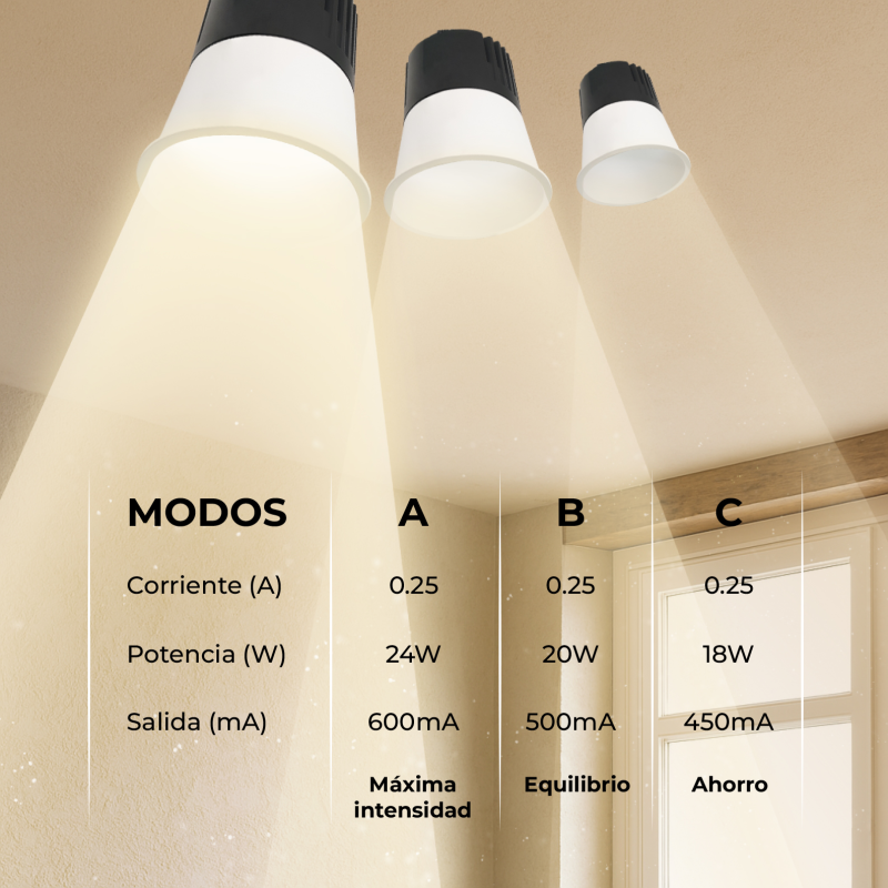 Tra le sue principali caratteristiche ci sono i suoi 3 livelli di potenza (18W, 20W, 24W), che permettono di regolare il livello di illuminazione secondo le necessità, offrendo diversi livelli di lumen per ogni ambiente.