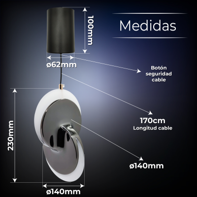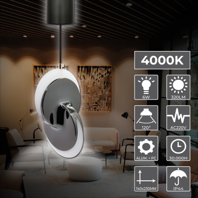 A Lâmpada de Teto Moderna Discos 6W combina design contemporâneo e eficiência. Destaca-se pelo seu brilho de 320 lúmens, um ângulo de abertura de 120º, proporcionando uma luz atraente e de alta qualidade com um índice de reprodução cromática superior a +90 CRI, indicativo da qualidade da luz emitida.