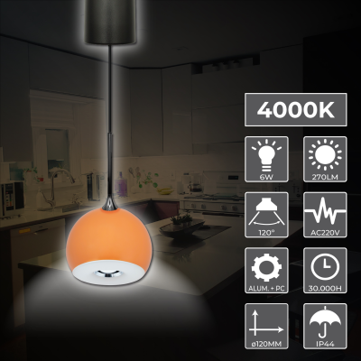 A Lâmpada de Teto Moderna Esférica 6W Ajustável combina design contemporâneo e eficiência. Destaca-se pelo seu brilho de 270 lúmens, um ângulo de abertura de 120º, proporcionando uma luz atraente e de alta qualidade com um índice de reprodução cromática superior a +90 CRI, indicativo da qualidade da luz emitida.