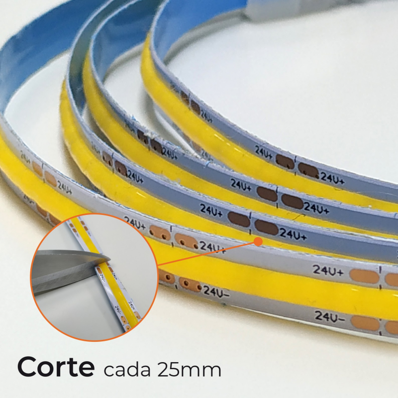 Rolo de 5 metros de Fita LED de Luz Contínua 24V. 950LM/m. 10W/m. IP20. Cortar a cada 25cm. Tira COB.