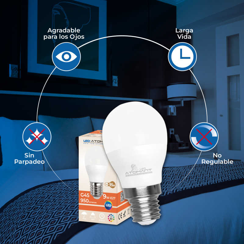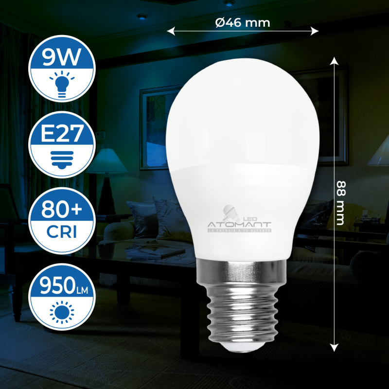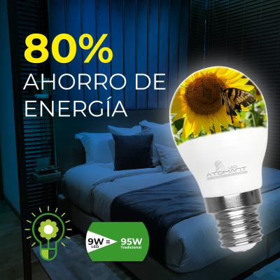 A lâmpada LED E27 G45 de 9W É ideal para substituir as lâmpadas tradicionais. Destaca a sua luminosidade 950umenes, um ângulo de abertura de 330º proporcionando uma luz atraente e de alta qualidade com um índice de reprodução cromática de +80 CRI.