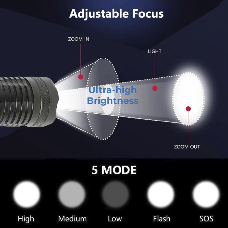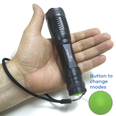 • 5 modos: luar/baixo/médio/alto e estroboscópico com memória. Clicar para ligar/desligar, tocar para mudar de modo, tocar duas vezes para selecionar o modo estroboscópico.