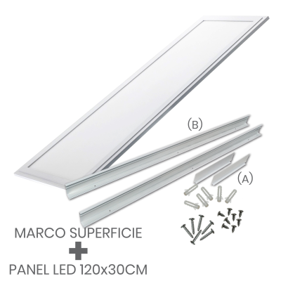 Esse kit de suporte + painel LED inclui um suporte de montagem em superfície e um painel LED de 120x30 cm oferecendo a possibilidade de ter um painel para tetos amovíveis com a opção de montagem em superfície quando desejado.