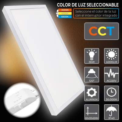 3 cores num só produto. Os nossos painéis CCT dispõem de um seletor de cores que permite obter diferentes tonalidades de luz no mesmo painel: Branco quente (3000K), Branco neutro (4500K) e Branco frio (6500K).